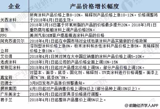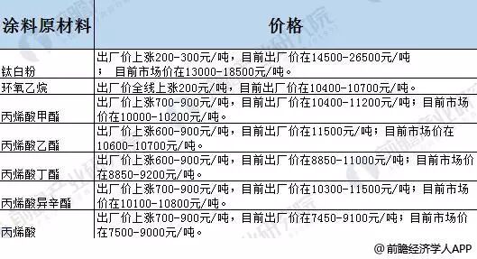 2018年涂料主要原材料价格涨声一片 从上述企业发布的调价公告中,均提到上调价格主要是由于原材料价格的大幅增长,导致涂料生产企业成本上升。 从2016年以来我国涂料主要原材料价格走势来看,整体呈现上升趋势,截2018年以来,主要产品中价格涨幅最少的是环氧乙烷和钛白粉,出厂价涨幅在200-300元之间;而丙烯酸甲酯、丙烯酸乙酯、丙烯酸丁酯、丙烯酸异辛酯、丙烯酸等的出厂价格涨幅均在700-900之间。 2016-2018年4月涂料行业主要原材料价格走势 2018年以来涂料行业主要原材料价格涨幅情况 原材料价格上涨推动涂料产品价格上浮 原材料价格的上涨,导致2018年以来我国涂料产品价格的上涨,根据前瞻产业研究院的梳理,2018年以来,PPG工业、老虎涂料、TCI粉末涂料、立邦、宣伟涂料、阿克苏诺贝尔、佐敦、海虹老人、关西涂料、艾仕得、嘉宝莉、华润、展辰、固克涂料、巴德士等国内外知名涂料企业相继宣布产品涨价,增长幅度在5%-25%之间。 全球主要涂料公司产品调价方案 VOCs治理力度加强,涂料企业 环保压力增大 从表层来看,涂料价格的上涨主要是由于原材料成本的上升。但是从深层次来看,环保压力的不断加大是涂料企业产品涨价的另一主因。 近年来,我国对于环境保护不断加码,对于环境污染的处罚力度也不断加强,就涂料行业来说, 作为传统制造业的一员,自然无法避免要面临高污染、高耗能的问题。因此,在环保高压下,企业用于环保改革的成本大幅增加。以三棵树为例,根据其年报披露,近两年公司环保支出较之前大幅增长,其环保支出占营业收入的比重也大幅增长,2013年的环保支出和占比分别为33.32万元和0.03%,而到了2017年,分别增长至991.81万元和0.38%,增长明显。 2013-2017年三棵树环保投入及占营业收入比重(单位:万元,%) 另外,根据前瞻产业研究院发布的《2018-2023年中国防腐涂料行业市场需求预测与投资战略规划分析报告》,涂料产品的挥发物质也会造成大气污染,雾霾中有21%的污染来自于VOCs排放,而VOCs排放中约18.5%是由溶剂型油漆的排放产生。根据国民经济“十三五”规划,“十三五”期间,根据工业涂装/印刷的VOCs污染防治要求,对涂料、油墨、胶粘剂、染料、化学助剂等化工行业要加大VOCs治理力度,要求到2019年底前,涂料生产企业VOCs治理达到2000家;到2020年底前,染料生产VOCs治理完成量达到300家。 环保重压下涂料行业趋势分析 前瞻产业研究院分析认为,随着国家对于环境保护的重视,涂料行业未来发展趋势将呈以下特点: 首先,从产品来看,企业产品研发将向水性涂料、UV涂料等环保产品方向发展; 其次,从行业企业发展来看,将会有一批中小企业在环保重压下黯然退场,行业企业集中度将会有所提升。 (来源:前瞻产业研究院)编辑:黄燕君